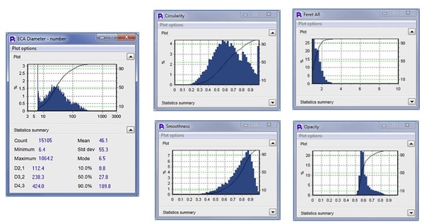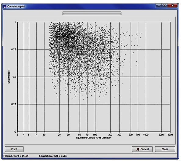 散點圖表式平滑度和粒徑之間存在負相關; 最小的物體是最光滑的。任何兩個粒徑或形狀測量值的相互依賴性都可以經由 Particle Insight 後處理來關聯。