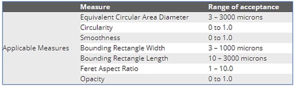 除了此處提供的統計概述之外,Pi Sentinel PRO 分析後處理功能還可以顯示所有粒子子組所使用的任何或所有測量的總分佈。它還允許觀察粒子影像圖和兩個測量相關圖。以“非常平滑”的子組為唯一關注點,在分析後處理函數中可以實現平滑度的下限為 0.89。