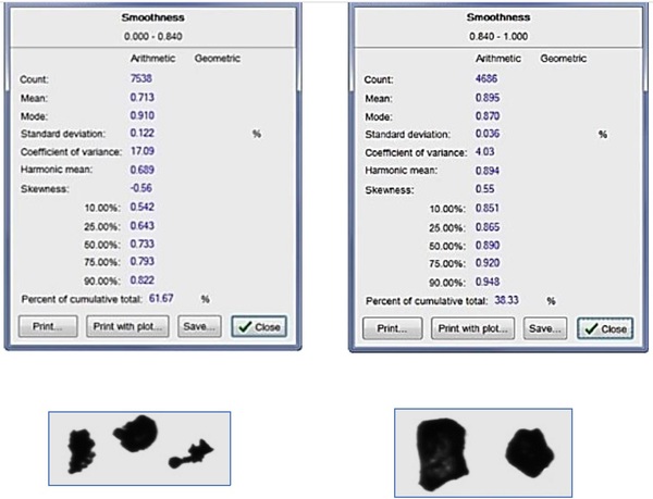 為了說明如何利用平滑度來區分子組,將總樣本分為“平滑”分類法和“粗糙”分類法。觀察粒子圖像,這種分離的邏輯變得明顯;這兩個次組是可辨別的。然後,平滑度分析將能夠有效地區分這些子組。在以下螢幕截圖中,使用 0.84 作為平滑度分割線。 綜合統計表格展示了通常實施的傳播手段和措施。