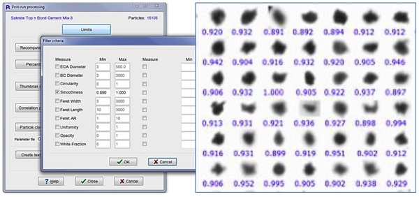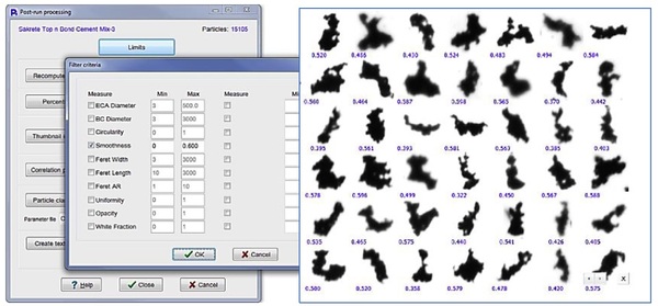 為了更仔細地檢查水泥樣品,可以在後期處理中分離出三個或更多具有大小和形狀特徵的顆粒次組。 例如,幾乎圓形的子組具有高真圓度和平滑度,同時具有低縱橫比。可以通過對“過濾條件”窗口中的三個指定值施加上限或下限,或兩者兼而有之來區分該子組。“棒狀”物體將具有低圓度和中等光滑度。使用平滑度測量可以區分特別不規則的形狀。可以經由軟體過濾大部分、進行額外的修改。