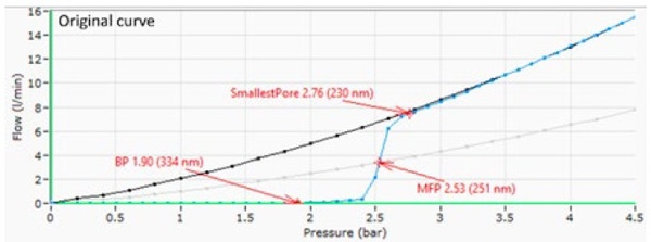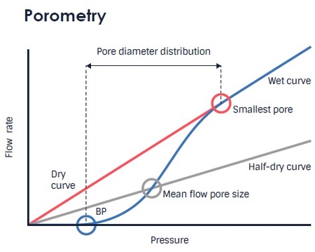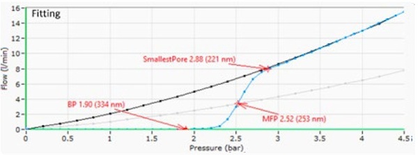 毛細流動孔徑分析法 (CFP)是一種用於測量各種過濾介質中孔徑和分佈的技術。測量過程經兩次分析——濕法和乾法。當對濕樣品進行測量時,會產生濕曲線。它表示施加的壓力與通過潤濕液體排空的孔的體積氣體流速之間的關係。另一方面,乾燥曲線表示氣體通過乾燥樣品時氣體流量的變化(氣體滲透率)。半乾曲線是將乾燥曲線除以二得到的。圖 1 顯示了用於確定最大、平均和最小孔徑以及孔徑分佈的典型測量結果。