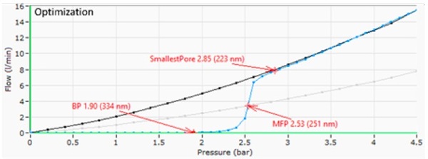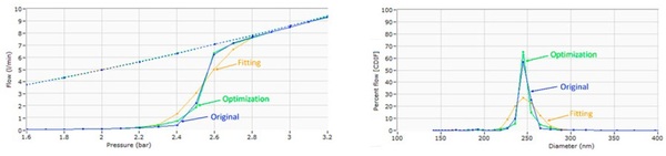 替代擬合的選擇可以直接影響核心結果,例如平均流量孔徑和最小孔徑,這取決於實驗曲線的形狀。它也影響孔徑分佈。透過選擇最佳化或擬合,可以降低噪訊水準並平滑孔徑分佈曲線