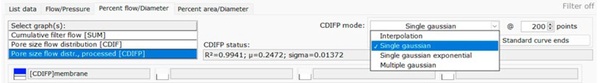 乾濕曲線處理功能可讓使用者對孔徑分佈曲線的形狀進行一定的控制。曲線處理的第二階段以分佈曲線為中心,提供各種擬合函數。使用者可以選擇最適合實驗數據的擬合函數。這種類型的曲線處理是資料分析的關鍵部分,可以透過選擇「Pore size flow distribution, processed [CDIFP]」選項在「Percent flow/Diameter」視窗中存取。