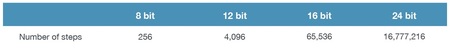 壓力傳感器提供介於 0-5 V、0-10 V或 0-15 V(對於類比電壓-Analogue voltage傳感器)或 0-20mA 或 4-20mA(對於類比電流Analogue current傳感器)之間的類比訊號 . 被我們以電腦的訊號端口讀取,類比訊號必須轉換為一系列數字值,我們稱之為“偵測點”。 如果我們想像一個樓梯的例子,解析度是覆蓋一定高度的距離的偵測點。將每一步的高度差視為數字值。偵測點取決於類比偵測器的好壞。 這用“位元數字-bit-number”表示(8 位元、12 位元、16 位元、24 位元)。偵測數字是 x 的 2次冪,其中 x是位元數