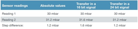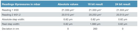我們以2個壓力讀值為例來比較傳感器的解析度如何影響最終結果的準確性。在 16 位元偵測器中,為了獲得讀值2,傳感器必須採取三個步驟。 理論壓差為 1.2 mbar,但一偵測點範圍不足以覆蓋它(每偵測點為 0.525 mbar)。 這使得兩個真實讀數之間的真實差異為 3*0.525 = 1.575 mbar(在表中為 1.6 mbar)。 在24位元偵測器中,解析度非常高(一偵測點範圍為 0.00175 mbar),因此在實踐中,它可以實現真正的 1.2 mbar讀數差異。如果使用這些壓力讀數來計算相應的孔徑,很明顯較低的訊號解析度處理會導致孔徑的較大偏差: